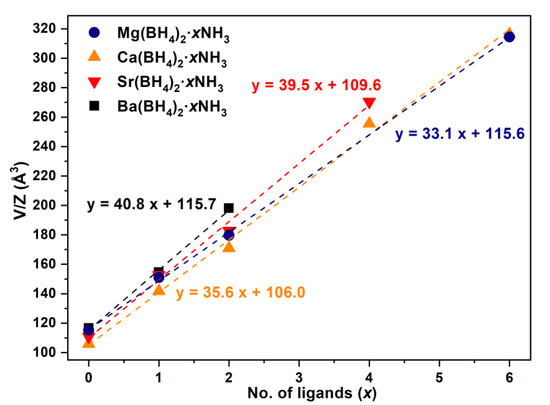 Volume per formula unit (V/Z) as a function of ammonia content in Mg(BH4)2·xNH3 (x = 1, 2, 3, 6) (blue circles), Ca(BH4)2·xNH3 (x = 1, 2, 4, 6) (orange triangles), Sr(BH4)2·xNH3 (x = 1, 2, 4) (red inverted triangles) and Ba(BH4)2·xNH3 (x = 0, 1, 2) (black squares).