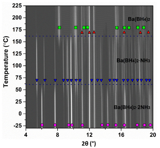 In situ SR-PXD for sample s2 measured from −30 to 225 °C (ΔT/Δt = 5 °C/min, p(Ar) = 1 bar, λ = 0.7129 Å). Ba(BH4)2·2NH3 (pink circles), Ba(BH4)2·NH3 (blue triangles), Ba(BH4)2 (green squares), BaH2 (red triangles).