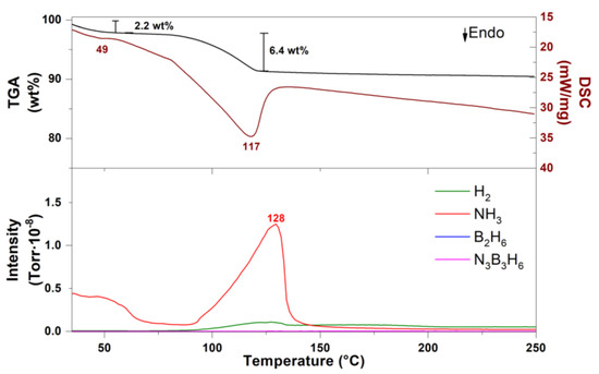 Thermogravimetric analysis (TGA) and differential scanning calorimetry (DSC) were measured using a STA 6000 from PerkinElmer (Waltham, MA, USA) coupled with a mass spectrometer (MS), HPR-20 QMS sampling system from Hiden Analytical (Warrington, UK). Approximately 5 mg of sample were placed in a Al2O3 crucible and heated from 30 to 250 °C with a heating rate of ΔT/Δt = 5 °C/min and an argon flow of 40 mL/min. The outlet gases were detected for hydrogen (m/z = 2), ammonia (m/z = 17), diborane (m/z = 27) and borazine (m/z = 80) using mass spectrometry.