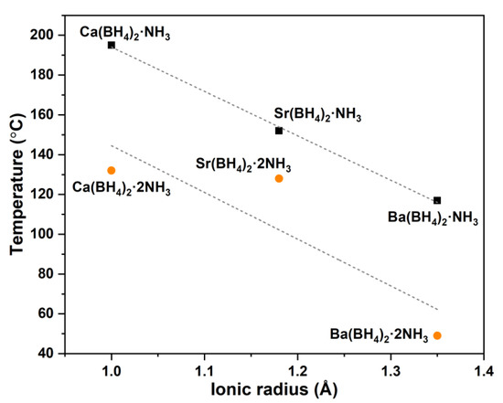 Decomposition temperatures for M(BH4)2·xNH3 (M = Ca2+, Sr2+, Ba2+ and x = 1, 2) [25]. The black squares and orange circles show the decomposition temperatures (maxima of the differential scanning calorimetry (DSC) signal) of M(BH4)2·NH3 and M(BH4)2·2NH3, respectively. The dashed lines show the correlation between decomposition temperatures and the ionic radii of the metal cations.