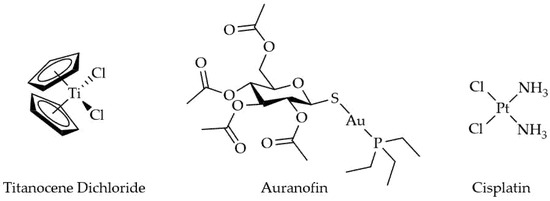 The chemical structures for titanocene dichloride, auranofin, and cisplatin.