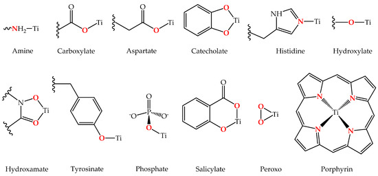 Typical Ti(IV) binding moieties of endogenous ligands with some representative coordination modalities. Reprinted from Coordination Chemistry Reviews, 363, M. Saxena, S.A. Loza-Rosas, K. Gaur, S. Sharma, S.C. Pérez Otero, A.D. Tinoco, Exploring titanium(IV) chemical proximity to iron(III) to elucidate a function for Ti(IV) in the human body, 109–125, Copyright (2018), with permission from Elsevier.