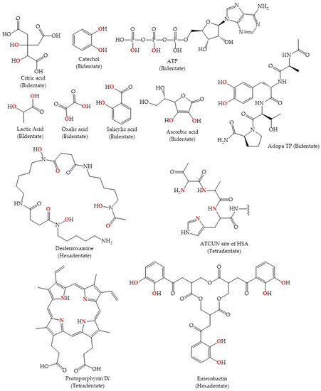 The biological coordination chemistry of Ti(IV) is dictated by it being a very strong Brønsted-Lowry acid and a Hard Lewis Acid. The Brønsted-Lowry property is observed in the extensive hydrolysis that water molecules bound to Ti(IV) undergo [19]. Standard Ti(IV) salts are difficult to prepare from aqueous solutions, as they often yield hydrolyzed species, and at weakly acidic, neutral, or basic pH, will precipitate from the solution [18,20,21]. Due to its propensity for hydrolysis, well-characterized compounds of Ti(IV) that are prepared or stabilized in an aqueous solution are somewhat rare. There are examples of stable Ti(IV) complexes containing chelating ligands that exhibit partial hydrolysis in the form of the titanyl unit (TiO2+) [22,23] or oxo bridges [24]. As a Hard Lewis Acid, Ti(IV) is predominantly coordinated by biological chelators that contain oxygen-rich binding moieties, although binding by nitrogen-containing chelators has also been observed (Figure 2 and Figure 3). The bioinorganic coordination chemistry of Ti(IV) largely mimics that of Fe(III) and is the subject of a recent review of ours [17].