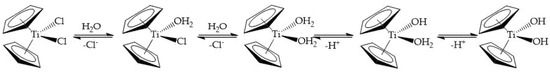 The hydrolysis of titanocene dichloride under acidic conditions focusing only on the dissociation of the chloro ligands.