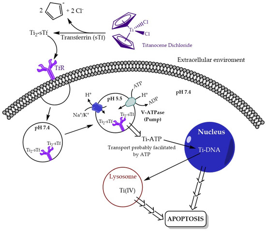- Guo, M.; Sun, H.; McArdle, H.J.; Gambling, L.; Sadler, P.J. Ti(IV) Uptake and Release by Human Serum Transferrin and Recognition of Ti(IV)-Transferrin by Cancer Cells: Understanding the Mechanism of Action of the Anticancer Drug Titanocene Dichloride. Biochemistry 2000, 39, 10023–10033. [Google Scholar] [CrossRef] [PubMed]