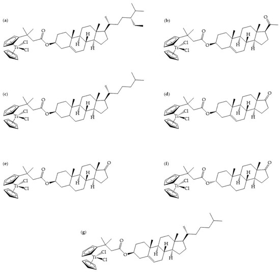 The chemical structures for titanocenyl clionasterol (a), pregnenolone (b), dihydrocholesterol (c), dehydroepiandrosterone (d), epiandrosterone (e), androsterone (f), and cholesterol (g) [67].
