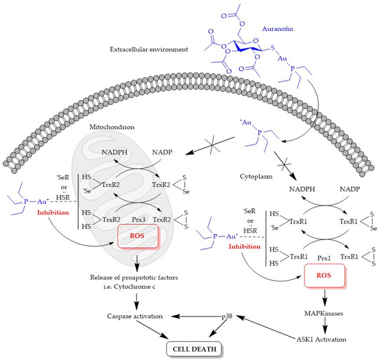 Like Cp2TiCl2, AF is classified a prodrug. Although Au(I) is able to bind to similar ligands as Pt(II) due to its Soft Lewis Acid nature, the proposed anticancer mechanism of action of AF and related Au(I) complexes is quite distinct from the Pt(II) drugs. DNA is not the primary target of these complexes. Their cytotoxicity is mediated by their ability to alter mitochondrial function and inhibit key enzymes by Au(I) binding strongly to functionally important thiol- or seleno-containing residues. Most of the thiol-containing enzymes, such as thioredoxin reductase (TrxR), glutathione reductase (GR), and cysteine protease, are overexpressed in cancer cells, thus providing potential anticancer targets for Au(I)-based therapy. Thiol groups are important in regulating mitochondrial membrane permeability. A study was performed on mitochondria isolated from rat livers [93]. In the presence of Ca2+ ions, Au(I) at submicromolar concentrations was observed to induce mitochondrial permeability transition [93]. In other words, the mitochondrial membrane becomes very permeable. This process appears to be triggered, in part, by Au(I) interfering with the thioredoxin redox system. The thioredoxin redox system comprises thioredoxin (Trx) and thioredoxin reductase (TrxR), which help to maintain redox balance within cells. Trx is found to reduce and activate many transcription factors involved in the regulation of cell growth and survival. Both Trx and TrxR are expressed as isoforms for cytosolic (TrxR1, Trx1) and mitochondrial (TrxR2, Trx2) localization [94]. These enzymes interact with one another in a tightly regulated redox process involving the formation of disulfide bonds in Trx and a sulfide and selenide bond in TrxR (Figure 10). As Au(I) binds tightly to thiol and selenol groups, it behaves as a potent inhibitor of Trx and TrxR. TrxR inhibition is particularly high (IC50 = 2.6 nM for purified enzyme) [95]. AF provokes an alteration of the redox state of the cell, leading to an elevated production of reactive oxygen species (ROS) beyond homeostatic control, which creates the conditions for apoptosis [94]. Apoptotic induction through a mitochondrion pathway is also observed with AF related complexes [96]. The inhibition of TrxR by these complexes can oxidize peroxiredoxin (Prx) enzymes. Peroxiredoxin 3 (Prx3) protects mitochondria from the ROS agent H2O2. This means that disturbance of Prxs can cause mitochondrial damage. High ROS levels disturbs the activity of cytosolic Prx1 and activates p38 MAPK, which can give a signal to the initiator caspase to trigger apoptotic events [94]. This trigger then leads to poly-ADP-ribose polymerase 1 degradation, DNA fragmentation, and finally, cell death. Due to the increased permeability of the mitochondrial membrane, the proapoptotic cytochrome c is released into the cytosol and contributes to signaling caspase-3 activation of apoptosis [95]. Despite DNA not being a direct target of Au(I), its replication can also be affected beyond fragmentation. AF can inhibit DNA polymerases essential for DNA replication if Au(I) binds to catalytically important sulfhydryl groups in these enzymes [89].