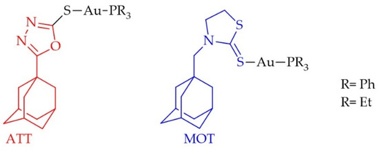 The Au(I) complexes with the sulfur coordinating groups 5-adamantyl-1,3-thiazolidine-2-thione (ATT) and 3-methyladamantane-1,3,4-oxadiazle-2-thione (MOT) and the phosphine ligands containing ethyl or phenyl substituents [104].