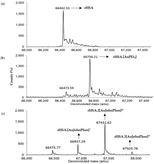 The ESI-TOF MS of free HSA (a) and HSA reacted with 1.33 equiv. of [AuPEt3]+ (b) and 1.75 equiv of [Au(JohnPhos)] (c) [107]. Adapted with permission from Dean, T.C.; Yang, M.; Liu, M.; Grayson, J.M.; DeMartino, A.W.; Day, C.S.; Lee, J.; Furdui, C.M.; Bierbach, U. Human Serum Albumin delivered [AuPEt3]+ is a potent inhibitor of T cell proliferation. ACS Med. Chem. Lett. 2017, 8, 572–576. Copyright (2017) American Chemical Society.