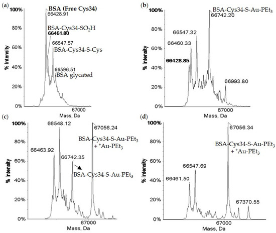 The ESI-MS of metal-free BSA (a) and BSA (100 μM) incubated with AuPEt3(CN) (b), AuPEt3(SCN) (c), AuPEt3(N3) (d) in a 3:1 metal to protein molar ratio after 1 h at pH 6.8 (20 mM NH4 Acetate) and 37 °C [108]. Note that metal-free BSA consists of several post translational modifications (PTMs) and only the Cys34 with no PTM is able to coordinate directly to Au(I). Also note that the incubation with AF produces an MS spectrum virtually identical to (b). Adapted with permission from Pratesi, A.; Cirri, D.; Ciofi, L.; Messori, L. Reactions of auranofin and its pseudohalide derivatives with serum albumin investigated through ESI-Q-TOF MS. Inorg. Chem. 2018, 57, 10507–10510. Copyright (2018) American Chemical Society.