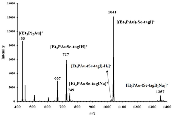 The ESI-MS spectra for the speciation of 10 mM SeAF (Et3PAuSe-tagl) in a 1:1 MeOH:H2O solution mixture [109]. Adapted with permission from Hill, D.T.; Isab, A.A.; Griswold, D.E.; DiMartino, M.J.; Matz, E.D.; Figueroa, A.L.; Wawro, J.E.; DeBrosse, C.; Reiff, W.M.; Elder, R.C.; Jones, B.; Webb, J.W.; Shaw, C.F. Seleno-auranofin (Et3PAuSe-tagl): synthesis, spectroscopic (EXAFS, 197Au Mossbauer, 31P, 1H, 13C, and 77Se NMR, ESI-MS) characterization, biological activity, and rapid serum albumin-induced triethylphosphine oxide generation. Inorg. Chem. 2010, 49, 7663–7675. Copyright (2010) American Chemical Society.