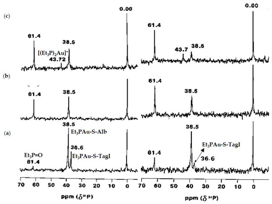 31P{1H} NMR spectra of 4.3 mM BSA (containing ~50% free Cys34) incubated with Et3PAuX (X = S-tagl, CN, Se-tagl) at 1:1 ratio with the free Cys34 and measured within 1 h (left) and after 24 h (right) at pH 7.9 in deuterated NH4HCO3 buffer; Et3PAuS-tagl (a), Et3PAuCN (b), and Et3PAuSe-tagl (c) [109]. Adapted with permission from Hill, D.T.; Isab, A.A.; Griswold, D.E.; DiMartino, M.J.; Matz, E.D.; Figueroa, A.L.; Wawro, J.E.; DeBrosse, C.; Reiff, W.M.; Elder, R.C.; Jones, B.; Webb, J.W.; Shaw, C.F. Seleno-auranofin (Et3PAuSe-tagl): synthesis, spectroscopic (EXAFS, 197Au Mossbauer, 31P, 1H, 13C, and 77Se NMR, ESI-MS) characterization, biological activity, and rapid serum albumin-induced triethylphosphine oxide generation. Inorg. Chem. 2010, 49, 7663–7675. Copyright (2010) American Chemical Society.
