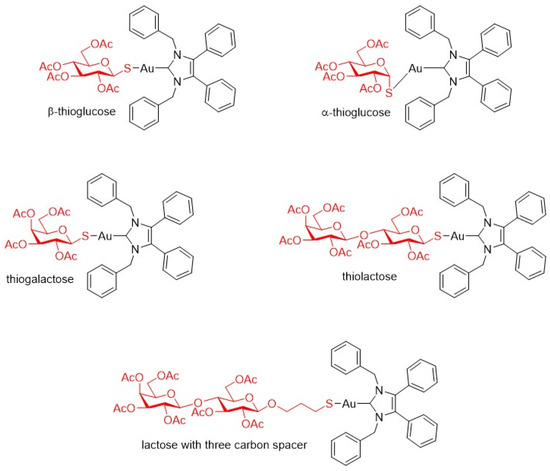 The structures of (1,3-dibenzyl-4,5-diphenyl-imidazon-2-ylidene)gold(I) complexes containing different sugars [110].