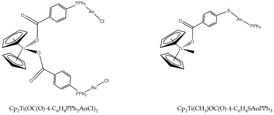 The chemical structures for Cp2Ti(OC(O)-4-C6H4PPh2AuCl)2 and Cp2Ti(CH3)OC(O)-4-C6H4SAuPPh3.