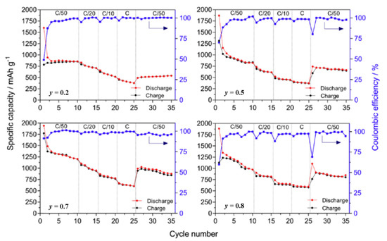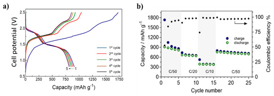 Cell ConfigurationMaximum Capacity, mAh g−1Reversible Capacity at C-RateReported Cycle NumberRetention Capacity, mAh g−1 at the Last CycleReference