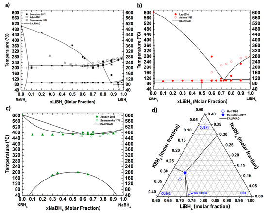 Table 3. Assessed (ΔHmASS) values (in kJ mol−1) for the enthalpy of melting in pure and mixed borohydrides. Assessed (ΩASS) values (in kJ mol−1) of the interaction parameters for the liquid phase, according to the regular solution model.