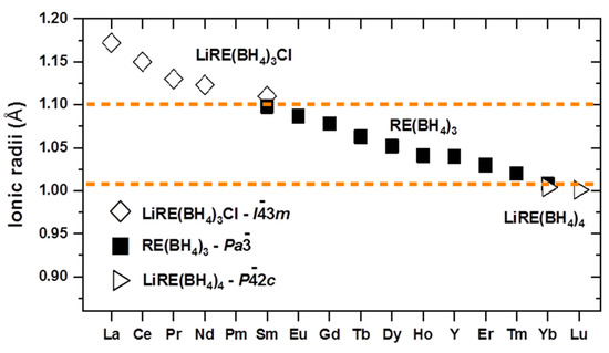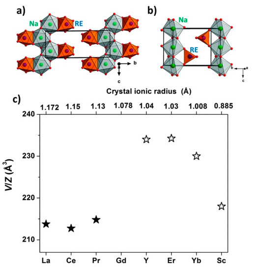 Figure 25. Crystal structures of (a) NaRE(BH4)4, RE = La, Ce, Pr and (b) NaRE(BH4)4. RE = Y, Er, Yb, Sc. RE: blue, Na: green, and B: red. H atoms are removed for clarity. (c) The unit cell volumes per formula unit, V/Z, of the known bi-metallic sodium rare earth borohydrides. Symbols: ★, NaRE(BH4)4, RE = La, Ce, Pr (Pbcn) and ☆, NaRE(BH4)4, RE = Y, Er, Yb, Sc (C2221 or Cmcm). The figure was adapted from [401] with permission from The Royal Society of Chemistry.