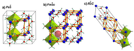 Figure 23. Crystal structures of trivalent rare earth borohydrides with space groups (a) P a 3 ¯ , (b) F m 3 ¯ c , (c) R 3 ¯ c . The figure was adapted from [408] with permission from The Royal Society of Chemistry.