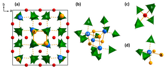 Figure 24. Crystal structure of LiRE(BH4)3Cl, RE = Ce, Pr, Nd, Gd and LiLa(BH4)3X, X = Cl, Br, I compounds. (b) Isolated tetranuclear anionic clusters [RE4X4(BH4)12]4− with a distorted cubane La4X4 core and (c) tetrahedral coordination of Li to four BH4 groups. (d) Octahedral La coordination to three BH4 groups and three X atoms. Symbols: La, blue sphere; halide X, yellow sphere; Li, red sphere; green tetrahedrons are BH4 anions with a whitish sphere (boron) inside and hydrogen on the corners. Adapted with permission from GharibDoust, S., M. Brighi, Y. Sadikin, D.B. Ravnsbæk, R. Černý, T. Jensen, and J. Skibsted, Synthesis, Structure and Li Ion Conductivity of LiLa(BH4)3X, X = Cl, Br, I. J. Phys. Chem. C, 2017. 121: pp. 19010–19021. Copyright (2017) American Chemical Society.