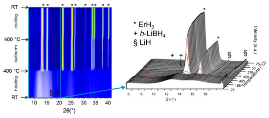 Figure 26. In situ SR-XPD data of a composite containing desorbed Er(BH4)3 + 50 wt % LiH. The composite was thermally treated from RT to 400 °C with a 1 h isotherm and cooling to RT, all in p(H2) = 100 bar (temperature ramp of 5 °C min−1). Inset showing magnification of the 2θ range 5 to 20° to enhance the visibility of the appearance of Bragg peaks for h-LiBH4 (+). The red curve in the magnification marks the end temperature of 400 °C. λ = 0.69733 Å. The figure was adapted from [406], published by the PCCP Owner Societies.