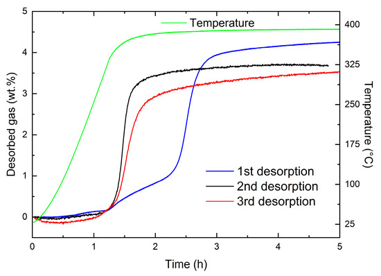 Figure 27. Sieverts’ measurement for 3LiBH4-Er(BH4)3-3LiH. p(H2) = 5–10 bar. The samples were treated from RT to 400 °C (ΔT/Δt = 5 °C min−1).