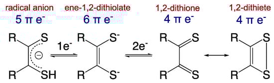 Importantly, these non-innocent dithiolene ligands can modulate the nature of the covalent bonding with transition metal ions via the various redox states accessible to the dithiolene (Figure 3) [13]. The ene-1,2-dithiolate is the reduced form of the ligand and possesses six π-electrons. This ligand form is both a σ-donor and π-donor that usually forms strong covalent bonds with an oxidized transition metal ion, as is observed in the active sites of most pyranopterin Mo and W enzymes (e.g., Mo(V)/Mo(VI)-dithiolene bonds). The radical anion form with five π-electrons is usually found in molecules chelated by multiple dithiolene ligands, where extended delocalization of the π-electrons and mixed-valency assists in the stabilization of the metal–ligand bonds. The fully oxidized 1,2-dithione form of the ligand possesses only four π-electrons and can be described by two resonance structures (e.g., the 1,2-dithione and 1,2-dithiete). The low-lying empty π* orbitals of the S=C bonds in the dithione can accept π-electron density from electron-rich low-valent transition metals [16,17], thereby stabilizing such compounds. However, dithione-containing low-valent metal complexes are encountered much less frequently than high-valent transition metal ions coordinated by reduced forms of dithiolene ligands.