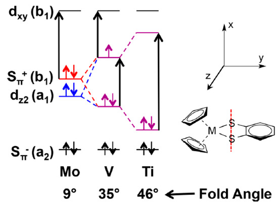 A combination of MCD, electronic absorption, electron paramagnetic resonance, resonance Raman, and photoelectron spectroscopies has been used in conjunction with theory to reveal vibrational control of metal–ligand covalency in a series of Cp2M(bdt) complexes (M = Ti, V, Mo; Cp = η5-C5H5) [60] (Figure 4). The work is important because it has allowed for a detailed understanding of how redox orbital electron occupancy (Ti(IV) = d0, V(IV) = d1, Mo(IV) = d2,) affects the nature of the M–dithiolene bonding scheme at parity of the ligand set and at parity of charge. In this series of complexes, large changes in the metallodithiolene fold angle and electronic structure are observed as electrons are successively removed from the redox orbital (Figure 4). These electron occupancy effects on the fold angle distortion are now understood in terms of the pseudo-Jahn–Teller effect (PJT). PJT-derived molecular distortions originate from the mixing of the electronic ground state (Ψ0) with specific excited states (Ψi) [61,62]. The ground state–excited state energy gap (2Δ), the matrix elements (F0i) of the vibronic contribution to the force constant (F), and the primary non-vibronic force constant (K0) all govern the degree of the ligand fold distortion according to: