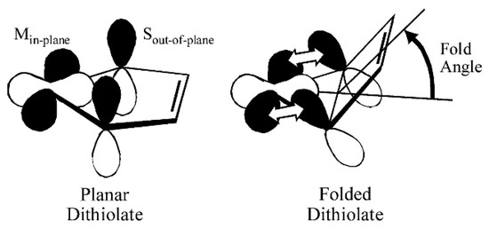 - Joshi, H.K.; Cooney, J.J.A.; Inscore, F.E.; Gruhn, N.E.; Lichtenberger, D.L.; Enemark, J.H. Investigation of metal-dithiolate fold angle effects: Implications for molybdenum and tungsten enzymes. Proc. Natl. Acad. Sci. USA 2003, 100, 3719–3724. [Google Scholar] [CrossRef]