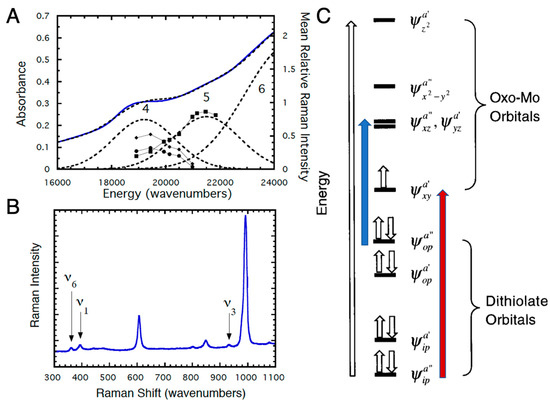 Experimental investigation of the electronic structures of the Mo centers of enzymes is difficult because of the intense absorptions from other chromophores (e.g., the b-type heme in sulfite oxidase and iron sulfur centers and FAD in xanthine oxidase) [37,38,39,40,41]. However, the effects of dithiolene coordination on electronic structure have been investigated for model oxo-Mo(V) compounds (Figure 6) by electronic absorption, XAS, magnetic circular dichroism (MCD), and resonance Raman (rR) spectroscopies [12,14,15,16,17,32,33,42,43,44,45,46,47,48,49,50,51]. For Tp*MoO(bdt), the electronic absorptions at 19,400 cm−1 (Band 4) and 22,100 cm−1 (Band 5) are assigned to S → Mo charge transfer bands (Figure 7A) [12]. These assignments have been confirmed by rR spectroscopy (Figure 7A,B), which shows three resonantly enhanced vibrations at 362.0, 393.0, and 931.0 cm−1. The lower frequency vibrations (ν1 and ν6) can be assigned to symmetric S–Mo–S stretching and bending vibrations, and the 931.0 cm−1 frequency (ν3) is primarily the Mo≡O stretch. Figure 7C shows a molecular orbital diagram that is consistent with the spectroscopic data of Figure 7A,B. Band 5 of Figure 7A is assigned as ψopa” → ψxza”, ψyza’ (blue arrow, Figure 7C), a transition which formally results in the promotion of an electron from an out-of-plane dithiolene molecular orbital to the nearly degenerate Mo dxz,yz-based orbitals, which are strongly antibonding with respect to the apical Mo≡O bond. This band assignment is supported by the rR enhancement of ν3 (squares) with excitation into Band 5 (Figure 7A,B). The preferential enhancement of vibrations ν1 (diamonds) and ν6 (circles) upon excitation at 514.5 nm (Figure 7A,B) supports assignment of Band 4 as the electronic transition ψipa” → ψxya’ (red arrow, Figure 7C), which promotes an electron from the antisymmetric in-plane dithiolene orbital (ψipa”) to the half-filled in-plane Mo dxy (ψxya’) orbital. The intensity of this electronic transition illustrates the covalency of in-plane metal–dithiolene bonding and suggests that such a pseudo-σ-mediated process could play a role in one-electron transfer steps of enzyme catalysis.
