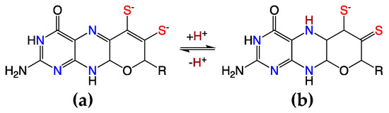Electronic coupling between the dithiolene and the pterin components of the PDT is most prevalent in the dihydropyranopterin form of the PDT [4,15,20,29,52]. This coupling is dramatically reduced in a tetrahydropyranopterin due to the loss of extended π-conjugation in these systems. Two-electron oxidation of the tetrahydro pyranopterin component of the PDT can result in an unusual asymmetric dithiolene known as the “thiol–thione” form that leads to bond and electronic asymmetry in the metal–dithiolene core [4,15,52]. As depicted in Figure 8, the two-electron oxidized 10,10a-dihydropyranopterin can undergo an induced internal redox reaction upon protonation at the N-5 position that involves a subsequent charge transfer between the dithiolene chelate and the piperazine ring of the pterin. This protonation results in a dominant monoanionic thiol–thione chelate form of the ligand when bound to Mo or W. This thiol–thione character can also occur in the absence of protonation by the concept of resonance, which may also be described as configurational mixing between the thiol–thione and dithiol states. This type of thiol–thione chelate has been observed and studied in a small molecule Mo(IV) systems [4,15,20,52]. In these systems, excited state thiol–thione character was shown to be admixed into the ground state configuration using a variety of spectroscopic and computational probes of the electronic structure. The analysis of the data indicates that a two-electron oxidized pterin is inherently electron withdrawing, allowing for a low-lying dithiolene → pterin intraligand charge transfer (ILCT) state to mix with the ground state to provide a variable degree of thiol–thione character in the electronic ground state.