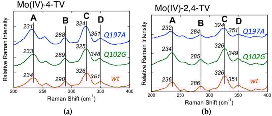 Low-frequency rR spectra for wt, Q102G, and Q197A XDH, MoIV−4-TV (a) and MoIV−2,4-TV (b). Raman spectra were collected on resonance with the Mo(IV) → P MLCT band using 780 nm laser excitation (Adapted with permission from Inorganic Chemistry, 2017, 56, 6830–6837. Copyright (2017) American Chemical Society).