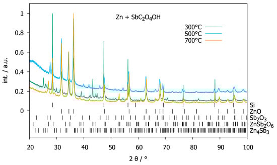 XRPD patterns (normalized intensities, Huber G670 diffractometer, CuKα1 radiation, internal standard silicon powder) of a mixture of Zn and SbC2O4OH with a 10:1 molar ratio after heat treatment at 573 K (green), 773 K (blue) and 973 K (orange), respectively.