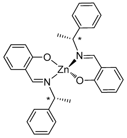 Then, in a Schlenk tube, 2-(R)-(+)-1-phenylethyliminomethyl]phenol (0.400 g; 1.77 mmol) was dissolved in ethanol (12 mL) under reflux. Powdered NaHCO3 (0.151 g, 1.79 mmol) was added to deprotonate the phenol group, and after 15 min, zinc(acetate)2 (0.198 g, 0.902 mmol) was added. The mixture was refluxed for 2 h and then filtered, and the filtrate was concentrated under reduced pressure until crystals precipitated. The known complex [78,80] was obtained by filtration as pale yellow crystals (0.420 g; 0.817 mmol; 91% yield; see elemental analysis and 1H NMR in Supplementary Materials).