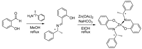 The known 2-(R)-(+)-1-phenylethyliminomethyl]phenol was prepared as previously reported by reaction of (R)-1-phenylethylamine with salicylaldehyde in refluxing methanol, as shown in Scheme 1 [84]. Deprotonation with NaHCO3 and reaction with zinc(acetate)2 in refluxing ethanol afforded the related bis{2-[(R)-(+)-1-phenylethyliminomethyl]phenolato-N,O}zinc(II) complex [78,80].