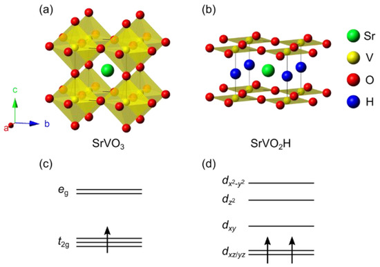 Crystal structures of (a) SrVO3 (space group Pm–3m) and (b) SrVO2H (space group P4/mmm). Green, yellow, red and blue balls represent Sr, V, O and H atoms, respectively. The solid lines indicate unit cells. The crystal field splitting for (c) SrVO3 and (d) SrVO2H. Further splitting of SrVO2H’s half-filled (dxz/yz)2 band occurs due to on-site Columbic repulsion, leading to a Mott insulating ground state.