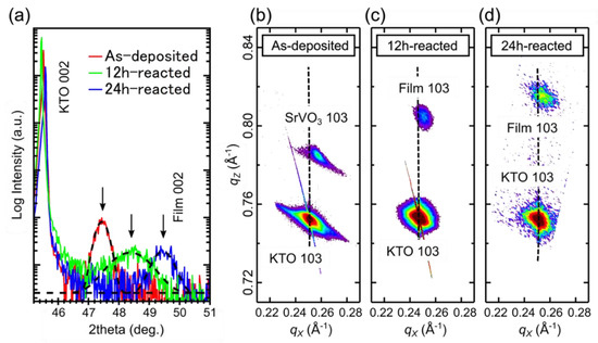 (a) XRD θ–2θ scans around the 002 peaks of the as-deposited, 12h-reacted, and 24h-reacted SrVO3 thin films on the KTaO3 substrates. The broken lines represent Gaussian fits. (b–d) RSM around the 103 reflections for the as-deposited (b), 12h-reacted (c), and 24h-reacted (d) SrVO3 thin films.