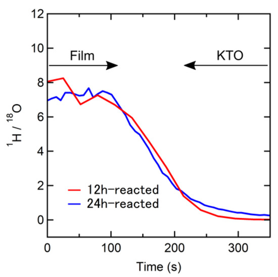 The hydride exchange was examined with secondary ion mass spectrometry (SIMS). We measured two areas (100 × 100 µm2) of each film in order to investigate the hydrogen content and its distribution. Figure 3 shows the SIMS profiles of the ratio of secondary ion intensities 1H/18O for the films after 12 h and 24 h reduction. For both films, a high hydrogen signal was observed, with clear contrast at the boundary between the substrate and the film. The hydrogen signal in the KTO substrate is much smaller than the target films, though it is 10–100 times higher than the case of LSAT [19,20], which might reflect some reactivity with CaH2. For the film reacted for 24 h (i.e., SrVO2H), homogeneous hydrogen distribution is confirmed, with 1H/18O values at the two areas of 7.2 (2SD 0.5) (Figure 3, blue) and 7.5 (2SD 1.0). Most importantly, hydrogen is almost homogeneously distributed in the 12h-reacted film, with 1H/18O values of 7.4 (2SD 1.4) (Figure 3, red) and 8.2 (2SD 0.8), similarly to those of the 24h-reacted film. This result strongly suggests that the intermediate phase has roughly the same hydride concentration as SrVO2H, though it might have some level of anion nonstoichiometry. This interpretation is supported by the close cell volumes (57.5 Å3 and 57.4 Å3 for 12h- and 24h-reacted films, respectively). The intermediate tetragonal phase is less anisotropic with a c/a = 0.96, compared to the 24h-reacted film and the bulk sample of SrVO2H with a c/a = 0.93.