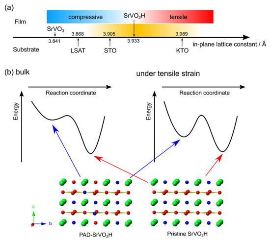 Recall that a longer time treatment with CaH2 (e.g., 24 h) resulted in the anion-ordered SrVO2H (Figure 1b). This fact strongly suggests that the partially disordered phase is a kinetically trapped transient state, shown in the reaction coordinate diagram in Figure 4b. In the bulk form, the energy of PAD-SrVO2H’s state is rather high and the potential well of this state is shallow (meaning a low activation energy to the final phase of SrVO2H) so that hydride reduction of SrVO3 leads rapidly to the anion-ordered SrVO2H (Figure 4b, left). On the other hand, when tensile strain is applied, the PAD-SrVO2H state may be kinetically trapped if the strain can stabilize this state (Figure 4b, right), but the increase in the activation energy is not high enough to stop the further reaction from occurring at 530 °C. The origin is not clear, but the stabilization of PAD-SrVO2H by tensile strain might be rationalized from examples with other perovskites, where tensile strain tends to induce oxygen deficiencies (or hydride anions, in our case) at equatorial sites [23].