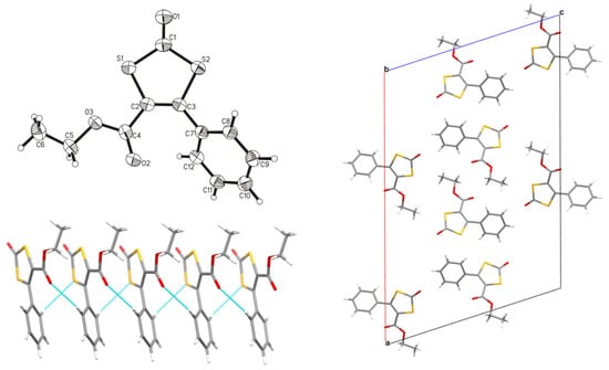 Top left: Molecular structure of 3 shown with 50% probability thermal ellipsoids. Selected bond lengths (Å) and angels (°): [C1–O1: 1.221(5), S1–C1: 1.761(4), S1–C2: 1.756(4), S2–C1: 1.764(4), S2–C3: 1.747(4), C2–C3, 1.353(5)]; [C2–C3–S2: 96.10(19), C3–C2–S1: 97.27(19), S1–C1–S2: 123.8(3)]. Bottom left: Non-classical intermolecular hydrogen bonding interactions (shown in light blue) forming chains, which protrude along the crystallographic b-axis (carbon: gray, hydrogen: white, oxygen: red, and sulfur: yellow). Right: Projection view of the crystal packing along the crystallographic b-axis.