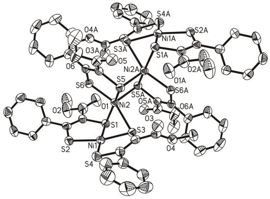 From the very beginning of dithiolene chemistry, nickel has always been an integral part of many respective investigations, either in the course of the synthesis of dithiolene ligands [,] as a dithiolene ligand transmitter to other metal ions (e.g., molybdenum or tungsten) [,,,,,] or as a central metal of interest for potential applications [,,,,,,]. Such applications of dithiolene-bearing compounds include molecular materials with conducting [], magnetic [,], and optical [] properties on account of their unique electronic structure.