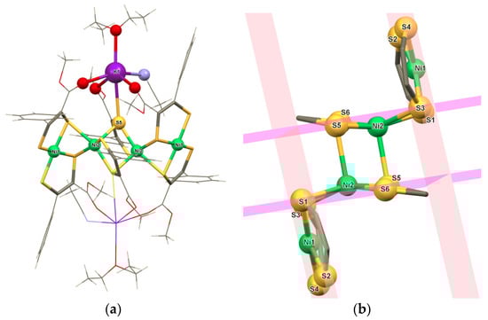 Infrared spectra of 4 were recorded both in the solid-state (KBr matrix) and in solution (CH3CN) (see the Supplementary Material, Figure S10). Assignment of the observed vibrational bands is based on a comparison with the ligand precursor’s IR spectrum and on an extensive previous respective report []. Vibrational bands are indeed shifted, significantly in parts, in the solid-state spectrum compared to the solution spectrum. In particular, the Ni–S band (~550 cm−1) and the C–S band (~1000 cm−1) regions show fewer and less intense signals in solution than in the solid-state. This indicates considerable changes in the molecular and/or electronic structures upon dissolving, which is again in accordance with the proposed dissociation of the tetrameric species into dimers or monomers in solution.