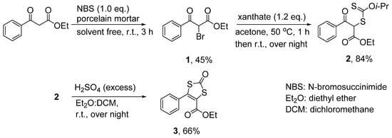 One of the most reliable and comparatively convenient procedures for the synthesis of dithiolene ligands (originally developed by Garner’s group in particular for those with unsymmetrical substitutions on the ene) employs the xanthogenation of α-bromoketones, followed by an acidic cyclization reaction [,]. Accordingly, the starting material in this study, ethyl benzoyl acetate, was treated with N-bromosuccinimide (NBS) in solvent-free conditions (Scheme 1) and purified by Kugelrohr distillation. The colorless oily product, 1, was subsequently reacted with the potassium salt of o-isopropyl xanthate to replace the bromine substituent by the R-CS2− moiety, affording xanthogenated compound 2 in 84% yield. The targeted dithiolene precursor 4-ethylcarboxylate-5-phenyl-1,3-dithiole-2-one (ecpdt = CO, 3) was obtained as a colorless crystalline solid through an acidic cyclization reaction with H2SO4 in a diethyl ether/dichloromethane solvent system and purified by column chromatography. Ligand precursor 3 was characterized inter alia by single-crystal X-ray diffraction (Figure 1).