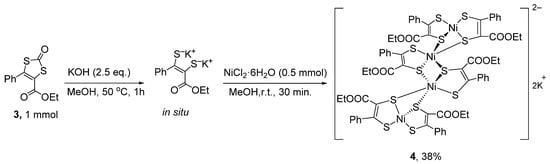 Preparation of the nickel-tetramer salt K2[Ni4(ecpdt)6] (4) (Et = ethyl, Ph = phenyl).