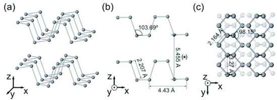 BP was the first single element layered material with semiconducting properties beyond those of group IV (graphene, silicene etc.). The crystal structure of BP was first proposed by Hultgren et al. in 1935 [14] and subsequently refined by Brown and Rundqvist in 1965 [15]. BP has an orthorhombic crystalline structure. P atoms have a sp3 hybridization, and each of them is connected to three adjacent atoms (the average bond length is 2.18 Å), with one lone pair of electrons and forming a puckered honeycomb structure (Figure 1) [1,16].