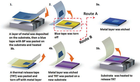 They first deposited a gold or silver layer onto the substrate (SiO2/Si wafer, Si wafer or other ones) via magnetron sputtering. Bulk BP was pasted on a blue tape and then pasted onto the substrate and heated. Then, the blue tape was torn off and the metal layer was removed so that the FLBP were left on the substrate (route A). With this technique, FLBP can also be transferred onto other substrates (route B).