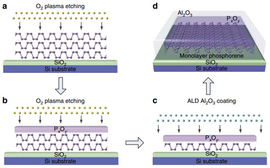 Pei et al. published a paper on the fabrication of air-stable and high-quality phosphorene samples, with a designated number of layers, through layer-by-layer thinning of thick exfoliated phosphorene flakes using oxygen plasma etching, followed by further passivation with an Al2O3 coating [22]. They were also able to precisely engineer the defects in a phosphorene monolayer.