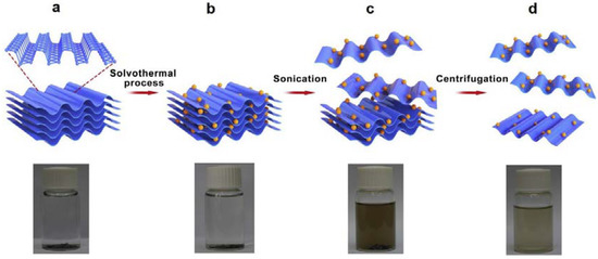 Yan et al. produced large phosphorene sheets using an efficient solvothermal-assisted liquid phase exfoliation method. BP flakes were mixed with acetonitrile (ACN) in an autoclave under nitrogen and then treated at 200 °C for 24 h [25] (Figure 4). The reaction products were sonicated for 30 min, 60 min, 120 min, and 240 min, in order to obtain different layers and sizes of BP nanosheets, and finally centrifuged to recover the supernatant.