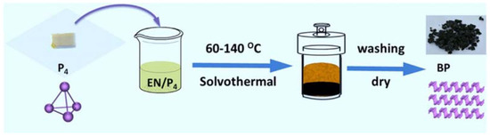 Schematic representation of the synthesis of few-layer BP nanosheets through a solvothermal process at the temperature range of 60–140 °C using white phosphorus as raw material and ethylenediamine (EN) as solvent [41].