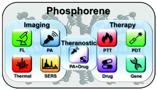 The multidisciplinary biomedical applications of phosphorene, including diagnostic imaging, phototherapy, therapeutic agent delivery, and theranostics (Reproduced with permission from [51], published by Royal Society of Chemistry, 2018).