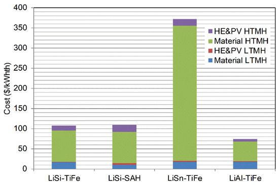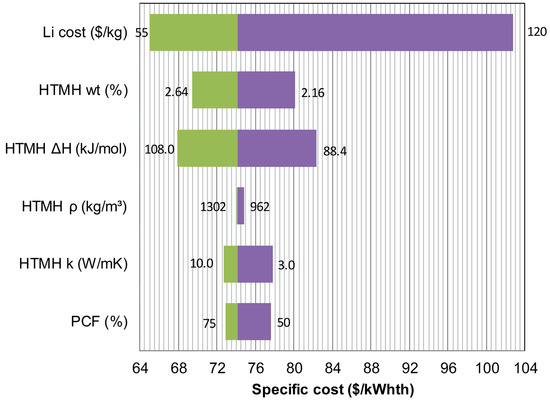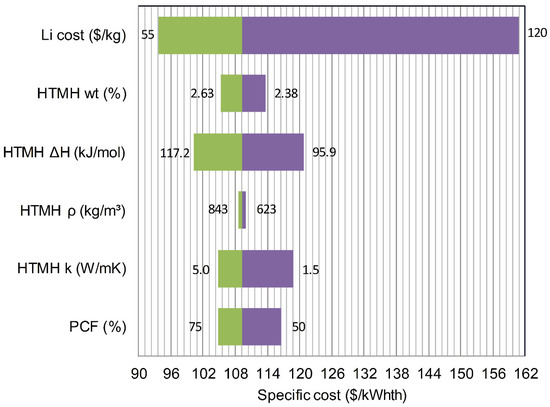 The HTMH thermal conductivity range was assumed based on the specific material properties. The LiSi maximum thermal conductivity was assumed equal to 5 W/mK (Figure 4 and Figure 5), given the reduced thermal conductivity of Li and Si, compensated by the presence of expanded natural graphite (ENG) (10 wt %) in the material. The LiAl maximum thermal conductivity was assumed equal to 10 W/mK (Figure 6). The value was calculated based on Al thermal conductivity, including the presence of ENG (10 wt %) in the pelletized material, and on results obtained for CaAl-based materials [22]. Additional experimental activities are required to confirm the assumed thermal conductivity values. The HTMH bulk density values ranged between −15% and +15% of the baseline bulk density values for each material, assuming a higher or lower compaction level. The HTMH reaction enthalpies ranged between −10% and +10% of the baseline reaction enthalpy value for each HTMH material. The proposed reaction enthalpy values could likely be verified with additional experimental measurements and possible minor modifications of the baseline material formulation. The LiSi weight capacity varied between −5% and +5% of the baseline value. Regarding the LiAl HTMH material, the cost sensitivity analysis was carried out assuming a larger range, between −10% and +10% of the baseline value, based on the experimental outcomes and discussions in Reference [23].